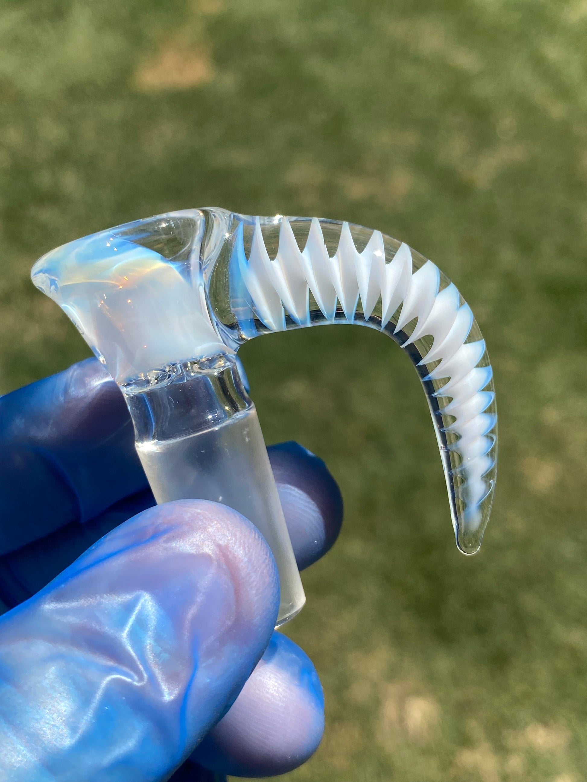 Where form meets finesse, the SimpleLemonFarmer Blue/White Slide exemplifies the balance between artistry and function. This handcrafted piece radiates sophistication — a seamless fusion of clarity and contrast, with its icy opalescent tones and spiraling white helix captured within transparent blue glass. Designed for both visual allure and reliable performance, it stands as a testament to modern glasswork precision.